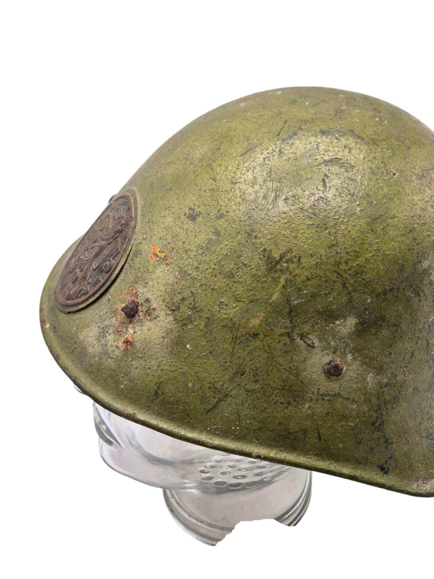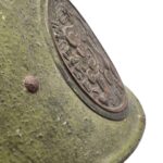 Zeer vroeg model M27 helm. De helm is uitgevoerd in een lichtgroene verf met zand wat gebruikelijk was bij de 1e modellen. Deze helmen zijn aanvankelijk zonder sleuf aan de achterzijde gefabriceerd echter is er later toch nog een sleuf in gemaakt hetgeen goed zichtbaar is aan de afgesprongen verf. De helm heeft jaren in een schuur gelegen en is door het weer iets aangetast. De kin riem is nog aanwezig alleen zijn helaas de klinknagels vergaan. Voor de helmen verzamelaar een fantastische aanvulling en een zeer zeldzaam stuk.